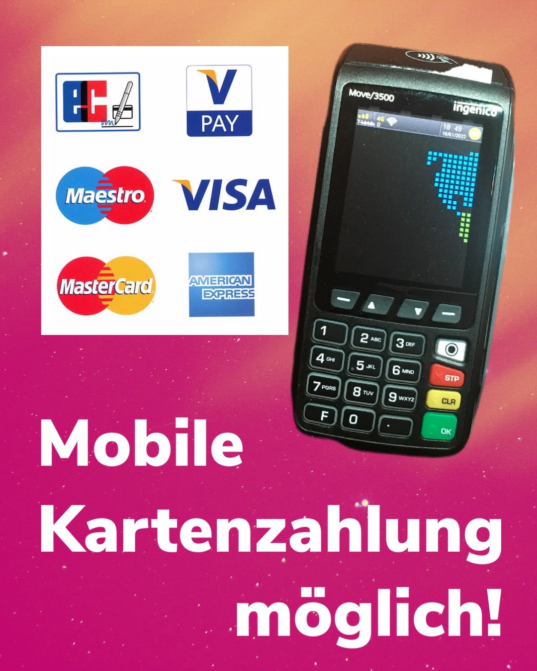 Wir akzeptieren: Amex, Visa, Maestro, Master, Giro- und EC Card.